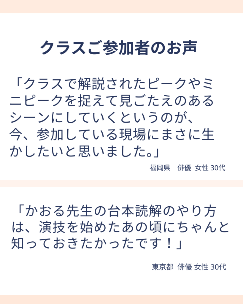 もし遠方の方でしたら、オンラインでの台本読解クラス及び季節ごとに開催しているオンラインクラスからお試しください。